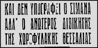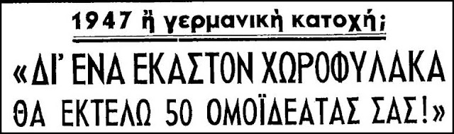 Ετσι, λοιπόν, σε μια εποχή που κυβέρνηση ήταν οι ιδεολογικοί πρόγονοι του Κυριάκου Μητσοτάκη – πρωθυπουργός ήταν ο Κωνσταντίνος Τσαλδάρης- και ενώ ο εμφύλιος πόλεμος ήταν σε ένταση, ο βαθμοφόρος μπάτσος, ανώτερος διοικητής της Χωροφυλακής Λάρισας, εκδίδει μια ανακοίνωση, αντιγραφή αυτών που υπήρξαν από τα Γερμανικά στρατεύματα την περίοδο της κατοχής.