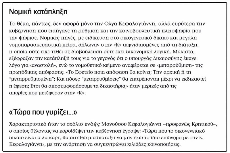 Η κυβέρνηση απαντά με τον κλασικό τρόπο: «Δεν είναι φωτογραφική», «αφορά όλους τους πολίτες», «δεν υπάρχει θέμα παραίτησης αυτή τη στιγμή». Ο Φλωρίδης υπερασπίζεται τη διάταξη ως λογική διόρθωση κενού στο οικογενειακό δίκαιο, η Κεφαλογιάννη λέει ότι ως μητέρα έχει τα ίδια δικαιώματα με οποιονδήποτε πολίτη. Μέχρι εδώ, όλα «νομιμότατα». Το πρόβλημα είναι ηθικό, (όπως τόνιζε προηγούμενο κείμενο της Καθημερινής), θεσμικό και πολιτικό: όταν ένας νόμος φαίνεται να εξυπηρετεί πρώτα μια υπουργό (ανιψιά Βαρδή Βαρδινογιάννη, μέλους ενός ισχυρού κύκλου επιχειρηματιών-ΜΜΕ), η εμπιστοσύνη στον θεσμό διαβρώνεται.