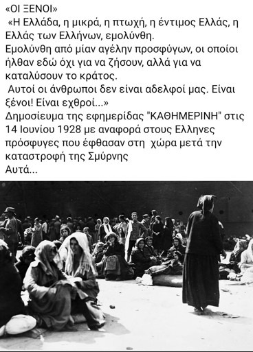 Ιστορικά πάντως υπήρξαν παρόμοιες περιπτώσεις. Και το πιο συγκλονιστικό είναι ότι αυτό το μίσος μερίδας Ελληνικού πληθυσμού δεν το εισέπραξαν μόνο οι ξένοι, αλλά και οι Ελληνες που βρέθηκαν στην “μητέρα – πατρίδα” μετά την Μικρασιατική καταστροφή.