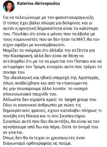 Επιπλέον το φασιστοειδές κάνει ό,τι ακριβώς το έχει διατάξει ο «φύρερ» της γαλάζιας εγκληματικής οργάνωσης. Μαζί με ένα στρατό αποκτηνωμένων χαραμοφάηδων, ψευτών, αλητών και τρολ, αποτελούν το μηχανισμό προπαγάνδας της ΝΔ. Οι ομάδες αλητείας είναι η μαύρη «καρδιά» της ΝΔ, ο πυρήνας της.
