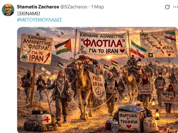 Ένας δημοσιογράφος, ο Σταμάτης Ζαχαρός, θεώρησε πνευματώδες να κατασκευάσει μια «αστεία» εικόνα υποτιθέμενης αλληλεγγύης προς τον ιρανικό λαό. Είναι τέτοια η ελεεινή συμπεριφορά του που δυσκολεύεσαι να βρεις λέξεις για να σχολιάσεις αυτή την αθλιότητα.