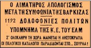 Σε όλη την διάρκεια του εμφυλίου πολέμου, παρακρατικές συμμορίες, ΜΑΥδες, χωροφύλακες και ο λεγόμενος “Εθνικός Στρατός”  θεωρούσαν “απόλαυση” να κόβουν τα κεφάλια σκοτωμένων ανταρτών του ΔΣΕ και με ζουρνάδες και νταούλια να μεταφέρουν τα μακάβρια “τρόπαια” τους από πόλη σε πόλη. στήνοντας γλέντια. (Είναι γνωστή η σκηνή από τον “Θίασο” του Αγγελόπουλου, με τα κομμένα κεφάλια του Άρη Βελουχιώτη και του πρωτοπαλίκαρού του Τζαβέλλα).