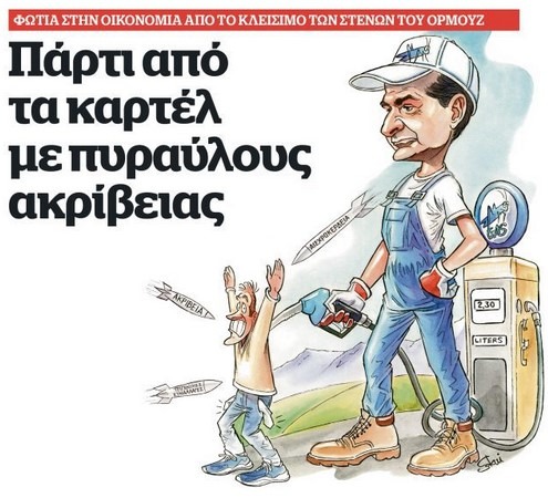 Η ελληνική κυβέρνηση πώς αντιδρά; Επαναφέρει τα μέτρα-φιάσκο του 2022 μετά την εισβολή της Ρωσίας στην Ουκρανία. Είναι το μόνο που γνωρίζει να κάνει για να μην κακοκαρδίσει τα καρτέλ. Το πάρτι αισχροκέρδειας θα συνεχιστεί με το πλαφόν στην αντλία και στα κέρδη των πετρελαϊκών εταιρειών. Στην πρώτη περίπτωση συμπιέζεται το κέρδος του τελικού αποδέκτη, των πρατηριούχων, ενώ στη δεύτερη διατηρούνται στα ίδια επίπεδα τα ήδη υψηλά κέρδη των κολοσσών του λιανεμπορίου.
