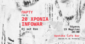 To Infowar του Αρη Χατζηστεφάνου κλείνει φέτες δυο δεκαετίες ζωής προσεγγίζοντας τα 1.000 επεισόδια – τουλάχιστον 600 από τα οποία είναι διαθέσιμα σαν podcast. Για τα γενέθλιά του σας καλεί την Πέμπτη, 19 Μαρτίου από τις 20:00 στο μπαρ Apoteka (Δεριγνύ 31, Πλ Βικτωρίας) με ένα Dj set από τον Rsn.