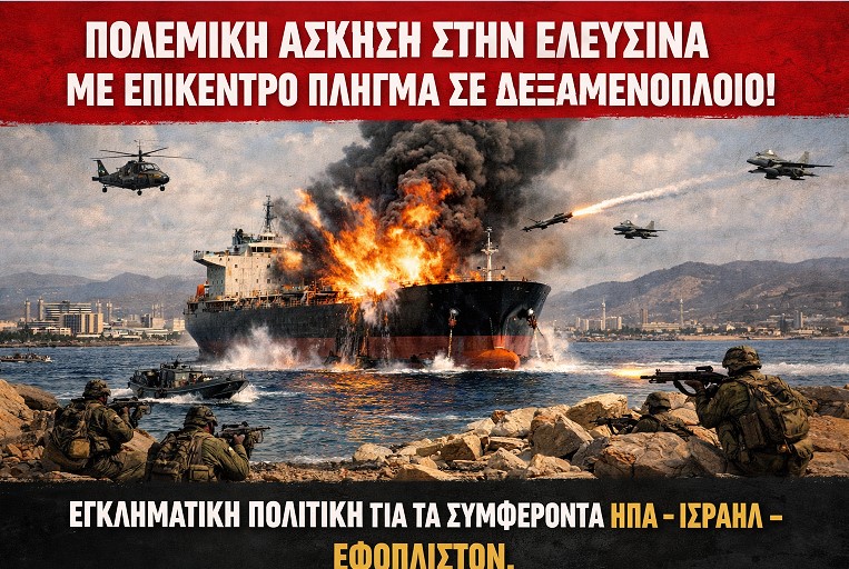 Η ανακοίνωση του Υπουργού Ε.Ν για πολεμική άσκηση την προσεχή Τρίτη στην Ελευσίνα, που έχει ως σενάριο πλήγμα κατά Δ/Ξ και την πρόληψη θαλάσσιας ρύπανσης ώστε “να δοκιμαστεί η ετοιμότητα, η ταχύτητα αντίδρασης και η ενεργοποίηση μέσων, τόσο του Λιμενικού σώματος όσο και ιδιωτικών φορέων”, και είναι ενταγμένη, σύμφωνα με τον ίδιο, στο πλαίσιο προετοιμασίας “ανταπόκρισης στις αυξημένες προκλήσεις που επηρεάζουν την ναυτιλία, τις εφοδιαστικές αλυσίδες και την διακίνηση ενέργειας” είναι ακόμη μια επικίνδυνη εμπλοκή της χώρας μας στον δολοφονικό πόλεμο που έχουν κηρύξει ΗΠΑ – Ισραήλ κατά του Ιράν.