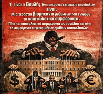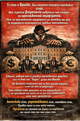 Κοίταξε τις αφίσες που φτιάξαμε. Εκεί ακριβώς είναι το νόημα:Οι βουλευτές – νυν και πρώην, από τη ΝΔ και όχι μόνο – είναι μαριονέτες. Κρέμονται από κλωστές που κρατάει ένας μεγαλοαστός κουκλοπαίχτης με πούρο, σακούλες δολαρίων και ευρώ δεξιά-αριστερά. Πίσω τους το κτίριο της Βουλής, σύμβολο της αστικής «δημοκρατίας». Το μήνυμα είναι ξεκάθαρο: οι πολιτικοί δεν είναι «ανεξάρτητοι» παράγοντες που «παρεκτρέπονται». Είναι εξαρτημένα εξαρτήματα του συστήματος που υπηρετούν τα συμφέροντα του κεφαλαίου – είτε άμεσα (πλουτοκράτες, μεγαλοεπιχειρηματίες, τράπεζες) είτε έμμεσα (μέσω του ίδιου του κρατικού μηχανισμού που διαχειρίζεται τα ευρωπαϊκά κονδύλια).