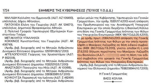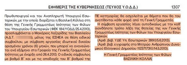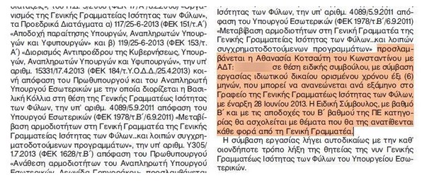 Στις 28 Ιουνίου 2013, µε απόφαση της γενικής γραµµατέας Ισότητας των Φύλων του υπουργείου Εσωτερικών η Αθ. Κοτσαύτη του Κωνσταντίνου προσελήφθη σε θέση «ειδικής συµβούλου» στο γραφείο της ΓΓ µε εξάµηνη σύµβαση που µπορούσε να ανανεώνεται ανά εξάµηνο. Το διάστηµα εκείνο ο Μ. Λαζαρίδης ήταν –και για πάνω από µία δεκαετία όπως αναφέρει και στο βιογραφικό του– συνεργάτης του τότε υπουργού ∆ιοικητικής Μεταρρύθµισης και αργότερα προέδρου της Ν∆ και πρωθυπουργού Κυρ. Μητσοτάκη σε θέµατα Τύπου και επικοινωνίας.