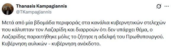 Λίγο αργότερα, από το Μαξίμου ήρθε η σαφής κατεύθυνση: παραίτηση για να μετριαστεί το πολιτικό κόστος. Τα επιχειρήματα του Λαζαρίδη περί «τεμπελιάς των αριστερών» και της δικής του «εξυπνάδας» δεν ήταν υπερασπίσιμα ούτε μέσα στη ΝΔ. Προκάλεσαν θύελλα, αποκάλυψαν μια αλαζονική και αποκομμένη από την κοινωνική πραγματικότητα νοοτροπία, και τελικά έγιναν μπούμερανγκ.