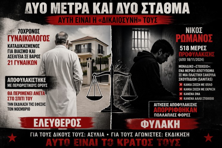 Ένα κράτος που προστατεύει τους ισχυρούς και εκδικείται όσους αντιστέκονται. Ένα σύστημα που αφήνει ελεύθερους βιαστές και σκανδαλοποιούς, την ώρα που κρατά φυλακισμένους αγωνιστές με φαιδρές αιτιολογίες.