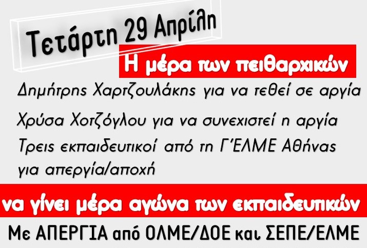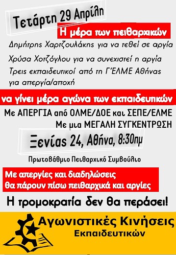 Την Τετάρτη 29 Απρίλη, οι ΟΛΜΕ/ΔΟΕ και οι ΣΕΠΕ/ΕΛΜΕ να κηρύξουν απεργία και να καλέσουν, έξω από το Πρωτοβάθμιο Πειθαρχικό Συμβούλιο, στην Ξενίας 24, στην Αθήνα, στις 8:30πμ, να γίνει μια μεγάλη συγκέντρωση.