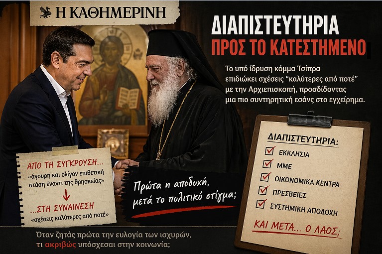 Το δημοσίευμα της Καθημερινή για τον Αλέξης Τσίπρας και τις «καλύτερες από ποτέ» σχέσεις του με την Αρχιεπισκοπή δεν είναι απλώς μια πληροφορία παρασκηνίου. Διαβάζεται ως αποτύπωση μιας στρατηγικής: παροχής διαπιστευτηρίων προς το κατεστημένο.
