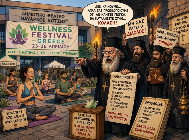 Όπως ξέρουμε από το «Όνομα του Ρόδου», οι μαζοχιστές ρασοφόροι ακούνε ευεξία, χαρά κλπ και νομίζουν πως βλέπουν τον Αντίχριστο! Η Wellness Festival Greece διοργανώνει το Φεστιβάλ Ευεξίας Ελλάδας από τις 23 έως τις 26 Απριλίου στο Δημοτικό Θέατρο “Ναύαρχος Βότσης” στην Καλαμαριά, κι αναρωτιέμαι, αν θα έχουμε το γνωστό όχλο φανατικών που θέλει να κάψει τους άπιστους. Καλλιόπη θα πας; Είναι μακριά, μόλις έρθουν κοντύτερα, έχει έτοιμο το δικράνι και τον πυρσό.