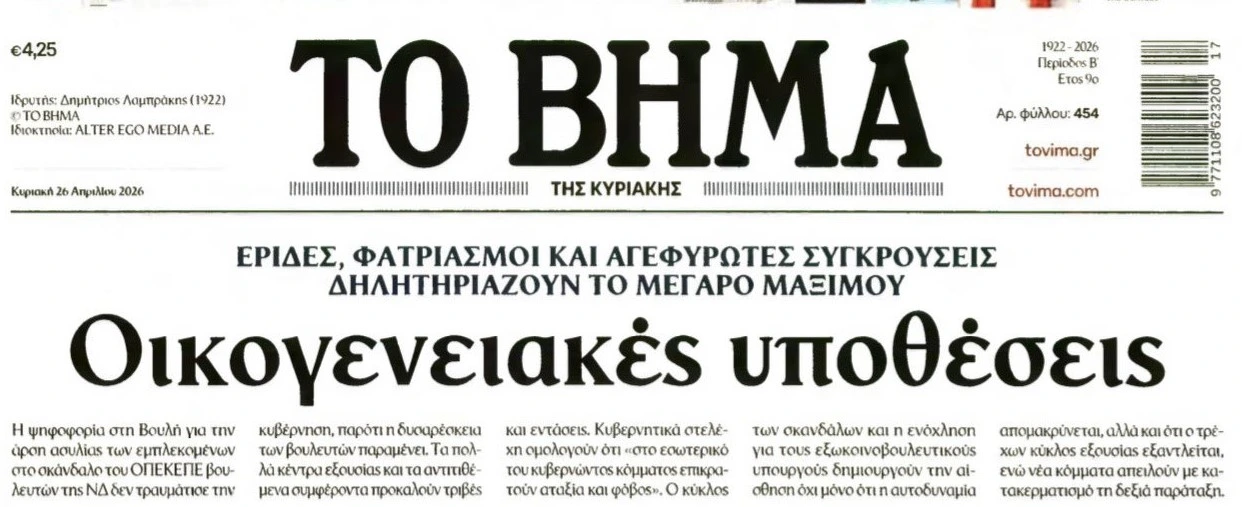 Ακόμη και τμήματα της συστημικής ενημέρωσης δεν μπορούν πλέον να συγκαλύψουν την πραγματικότητα. Το Το Βήμα κυκλοφόρησε με τίτλο «Οικογενειακές υποθέσεις», μιλώντας ανοιχτά για «έριδες, φατριασμούς και αγεφύρωτες συγκρούσεις» που δηλητηριάζουν το Μέγαρο Μαξίμου. Όταν φτάνει να το γράφει αυτό ο ίδιος ο αστικός Τύπος, η εικόνα είναι πέρα από κάθε αμφισβήτηση.