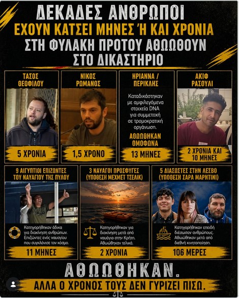 ▪️ Το slide δείχνει ενδεικτικές υποθέσεις ανθρώπων που έχουν κάτσει μήνες ή και χρόνια στη φυλακή προτού αθωωθούν στο δικαστήριο.