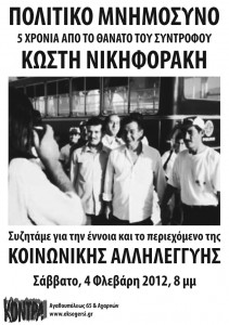 Το Σάββατο 4Φλεβάρη, η«Κόντρα» οργανώνει πολιτικό μνημόσυνο στα πέντε χρόνια από το θάνατο του συντρόφου μας ΚωστήΝικηφοράκη, ενός ξεχωριστού αγωνιστή πουμε τη δράση του και τοπαράδειγμάτου άφησε ανεξίτηλο το στίγμα του, ιδιαίτερα στην ευρύτερη περιοχή τωνΧανίων.