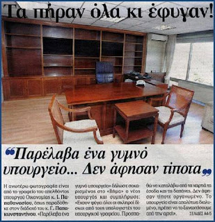 «Παρέλαβα ένα γυμνό υπουργείο. Πήραν ακόμη και τους σκληρούς δίσκους των υπολογιστών από το υπουργικό γραφείο!» συμπλήρωνε ο Γ. Παπακωνσταντίνου.