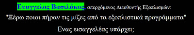 Σήμερα κατά τη διάρκεια της παράδοσης καθηκόντων στον νέο γενικό διευθυντή εξοπλισμών Δημήτρη Γεωργιόπουλο, ο Ε. Βασιλάκος, είπε: – «Δέχτηκα απειλές αλλά δεν υπέκυψα. Διάφοροι αλητήριοι παρασιτούντες με λοιδώρησαν με αισχρό τρόπο. Δεν ενέδωσα, δεν τα πήρα».