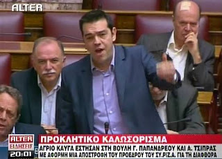 Και με την ευκαιρία, επειδή έχει εξαφανιστεί από όλα τα ΜΜΕ, η ουσία των λεγομένων του Τσίπρα, (τα οποία επικεντρώθηκαν μόνο στην εισαγωγή της τοποθέτησης του προέδρου του Σύριζα) αντιγράφουμε από τα πρακτικά της βουλής:
