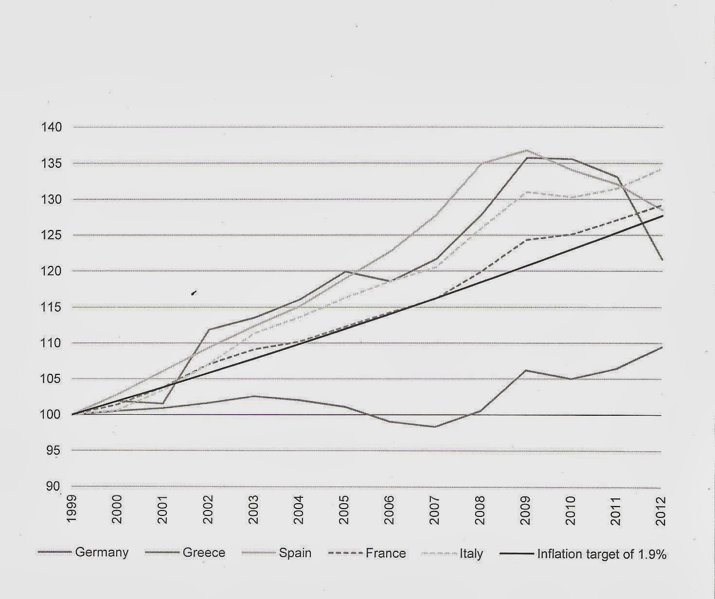 Ο κύριος λόγος απώλειας της ανταγωνιστικότητας, όπως επίσης δείχνει το διάγραμμα δεν ήταν μια μισθολογική έκρηξη στην περιφέρεια, αλλά η καθήλωση του εργατικού κόστους στη Γερμανία, ιδίως μέχρι το 2008. Το ανταγωνιστικό όφελος για τις γερμανικές επιχειρήσεις, δεδομένου ότι μέσα στην ΟΝΕ δε μπορεί να υπάρξει υποτίμηση, ήταν τεράστιο. Η γερμανική εμπορική υπεροχή οφείλεται σχεδόν αποκλειστικά στην πίεση που δέχθηκαν οι Γερμανοί εργάτες και ελάχιστα στην περιβόητη γερμανική αποτελεσματικότητα και τα συναφή.