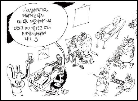 Αυτές τις μέρες, σειρά έχει ο Καλλικράτης στην υγεία. Έχει ήδη ξεκινήσει η λειτουργία του ολοήμερου Νοσοκομείου με ιδιωτικοοικονομικά κριτήρια, είσοδο 5 €, πληρωμή εξετάσεων και ακτινογραφιών.