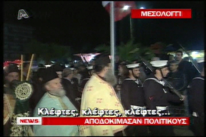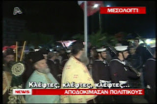Στο βίντεο που παραθέτουμε –από την τηλεόραση του Αλφα- παρακολουθούμε τις ανούσιες δηλώσεις του προέδρου της Δημοκρατίας και τις αποδοκιμασίες που εισέπραξαν –με συνθήματα του τύπου «κλέφτες, κλέφτες, κλέφτες», οι πολιτικάντηδες που βρέθηκαν στο Μεσολόγγι.