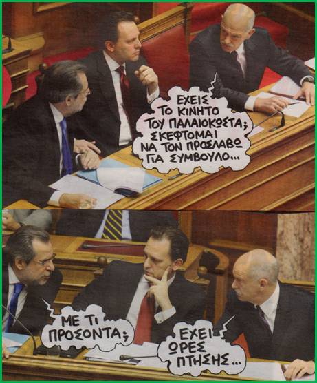 Αναγκάζονται δηλαδή και τα μέχρι χτες δεκανίκια της μνημονικής κυβέρνησης να θεωρούν τον ΓΑΠ ξοφλημένο και να ετοιμάζονται για την διάδοχη κατάσταση. Ο ίδιος όμως παραμένει με νύχια και με δόντια γαντζωμένος στην εξουσία. Αδιαφορεί εντελώς για την λαϊκή οργή και αγανάκτηση που υπάρχει στο πρόσωπο του.