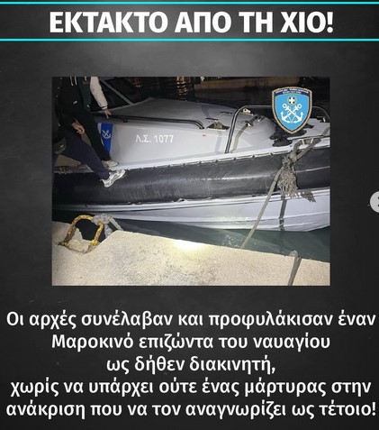 Πηγή: Ιάσονας Αποστολόpουλος – f/b ΕΚΤΑΚΤΟ από τη Χίο! Οι αρχές συνέλαβαν και προφυλάκισαν έναν Μαροκινό επιζώντα του ναυαγίου ως