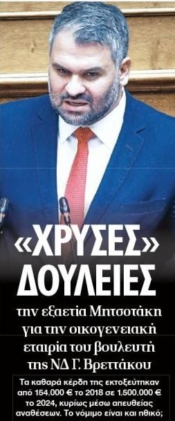 Η εφημερίδα “Δημοκρατία” σήμερα, (14/2/2026), φέρνει στο φως ένα ακόμα «success story» της εποχής Μητσοτάκη: την οικογενειακή εταιρεία Κ&Κ Βρεττάκος