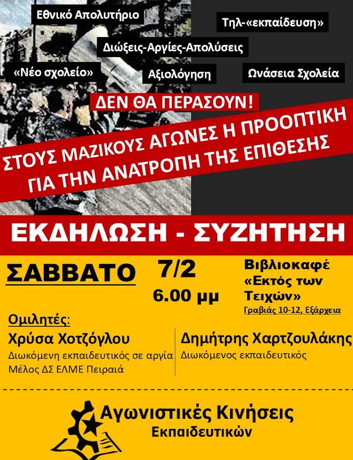 Σε μια νέα χρονιά που φαίνεται ότι ανοίγει πολλές αντιδραστικές εξελίξεις στην εκπαίδευση, οι Αγωνιστικές Κινήσεις Εκπαιδευτικών διοργανώνουν εκδηλώσεις, με